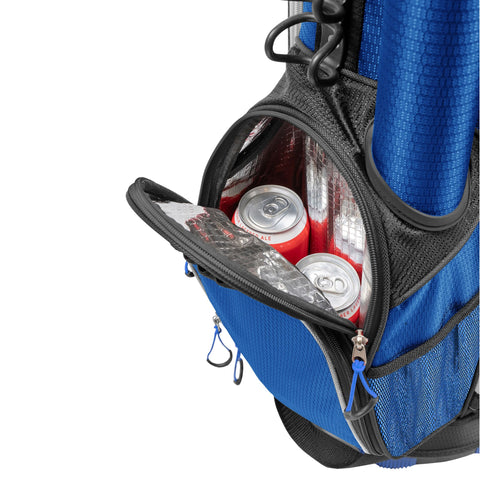 The Axglo A181 Lightweight Golf Cart Bag offers the best in golf club organization, durability, and protection. This bag is equipped with a 10.5" 14-Way organizer top with full-length individual dividers to keep your clubs organized and protected from the elements. The ergonomic soft-grip lift assist handles make it easy to transport your bag while 8 pockets provide ample storage for all of your accessories. The bag also features 2 large side accessory pockets, 3 ball holders, 2 waterproof zipped pockets, 1 cooler bag, and a putter pocket for extra convenience. This golf cart bag also includes an umbrella holder and rain hood.