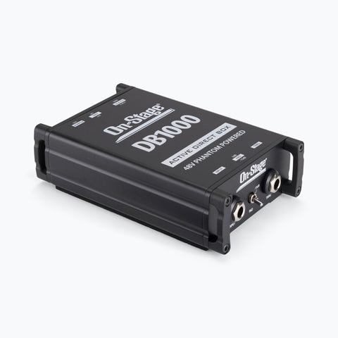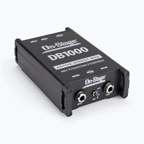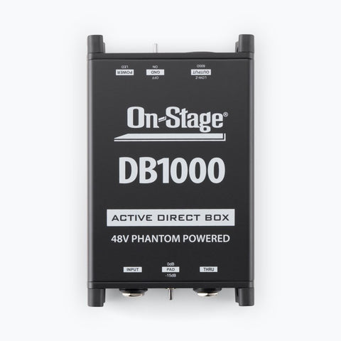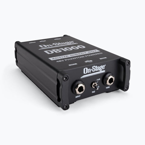 Our DB1000 Active DI Box converts any high-impedance 1/4" source to a low-impedance XLR signal ready to send via a long cable run to a mixer or PA system. Features include a -15 dB pad switch to prevent clipping, a throughput connector to pass unaltered signal to a stage amp, and a ground-lift switch to defeat ground-loop hum. Its heavy-duty metal enclosure protects the internal components and ensures reliable performance.