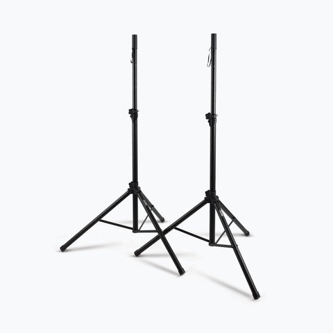 Our light-weight SSP7900 All-Aluminum Speaker Stand Pack comes with everything needed to support two speakers on individual stands. The stands feature versatile adaptable poles that support all standard speaker cabinet mounting sockets and their height adjusts to accommodate a variety of applications. Heavy-duty construction, braced bases, and nonslip feet work together to deliver exceptional stability and load balance even on irregular surfaces. The durable black finish preserves the professional appearance of any space. For convenient storage and ergonomic transportation, the tripod bases fold flat and all the components fit into an included carrying bag with an ergonomic shoulder strap.