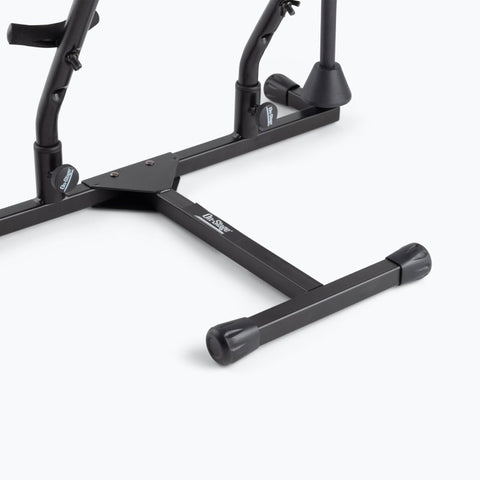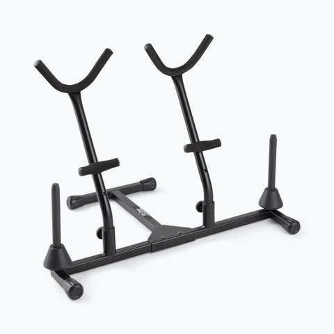 The SXS7201B Double Saxophone Stand provides secure storage for, and ease of access to, two saxophones and two flutes or clarinets. Four instruments can be held at once and all four are oriented so that they don't lie on their keys or other delicate parts. The saxophone yokes are angled back for proper balance and padding on the yokes increases traction while protecting the finishes of the instruments. Two removable pegs hold flutes or clarinets without touching the outsides of the instruments. The wide base delivers outstanding stability while nonslip feet prevent skids to keep the stand safely in place. For efficient storage and transportation, the stand folds down. With its black powder-coat finish that resists chips and scratches, this versatile accessory will remain looking fresh while adding to a professional presentation in any venue, recording studio, or streaming setup.