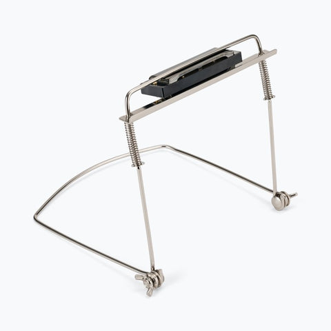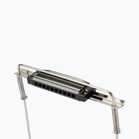 - Enables hands-free harmonica playing for simultaneously playing another instrument Holds harmonicas up to 6.5" for compatibility with smaller and larger instruments Easily adjusts position for optimal playing comfort Springs clamp the harmonica in place to prevent unwanted movement while playing